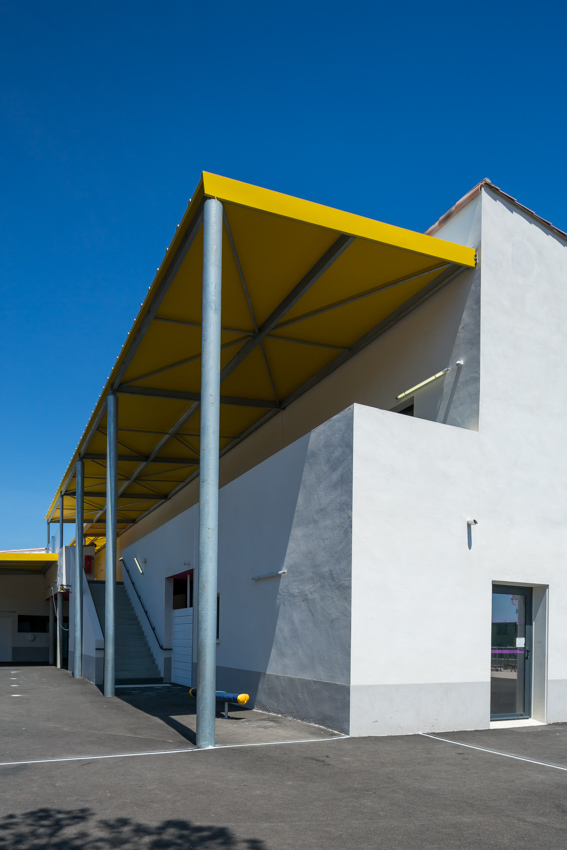 Les volumes principaux sont volontairement simples et respecte une écriture traditionnelle imposée par le PLU. Les éléments de liaison tels que les préaux, les coursives et les brise-soleil viennent dynamiser l’ensemble du bâtiment par leur écriture tonique et colorée.