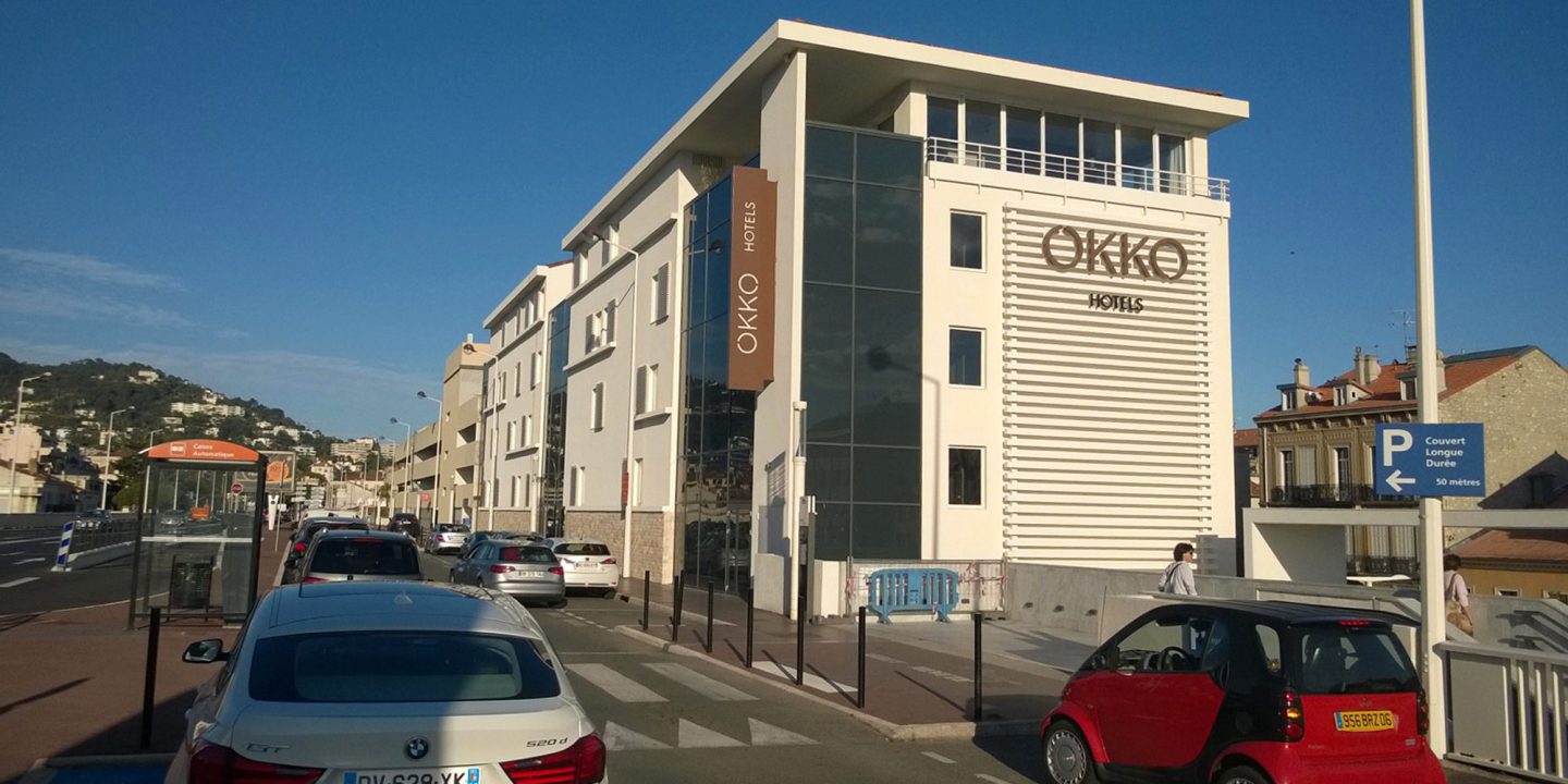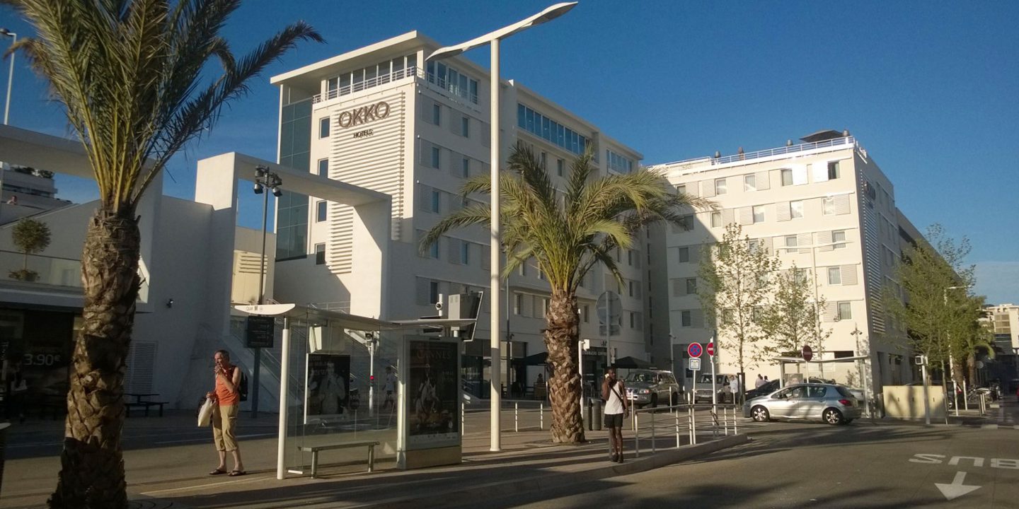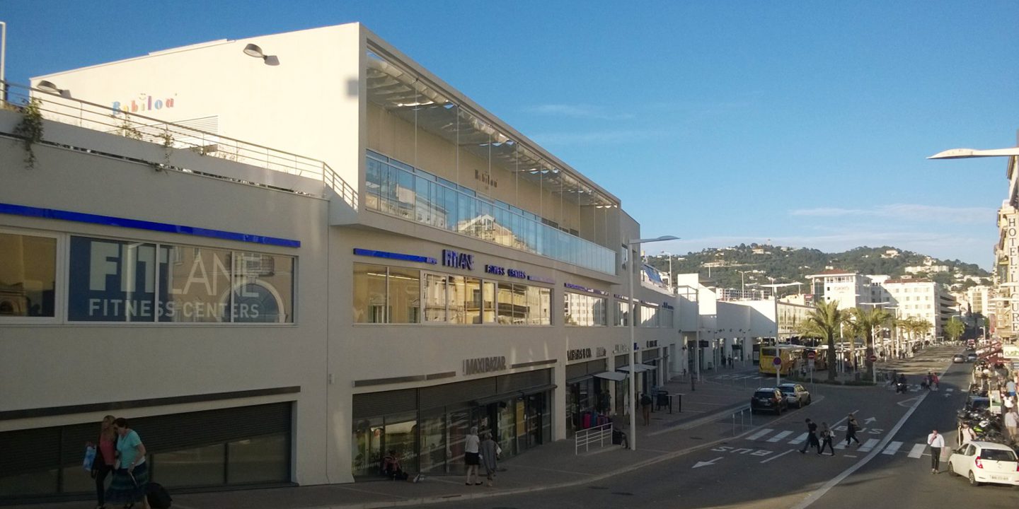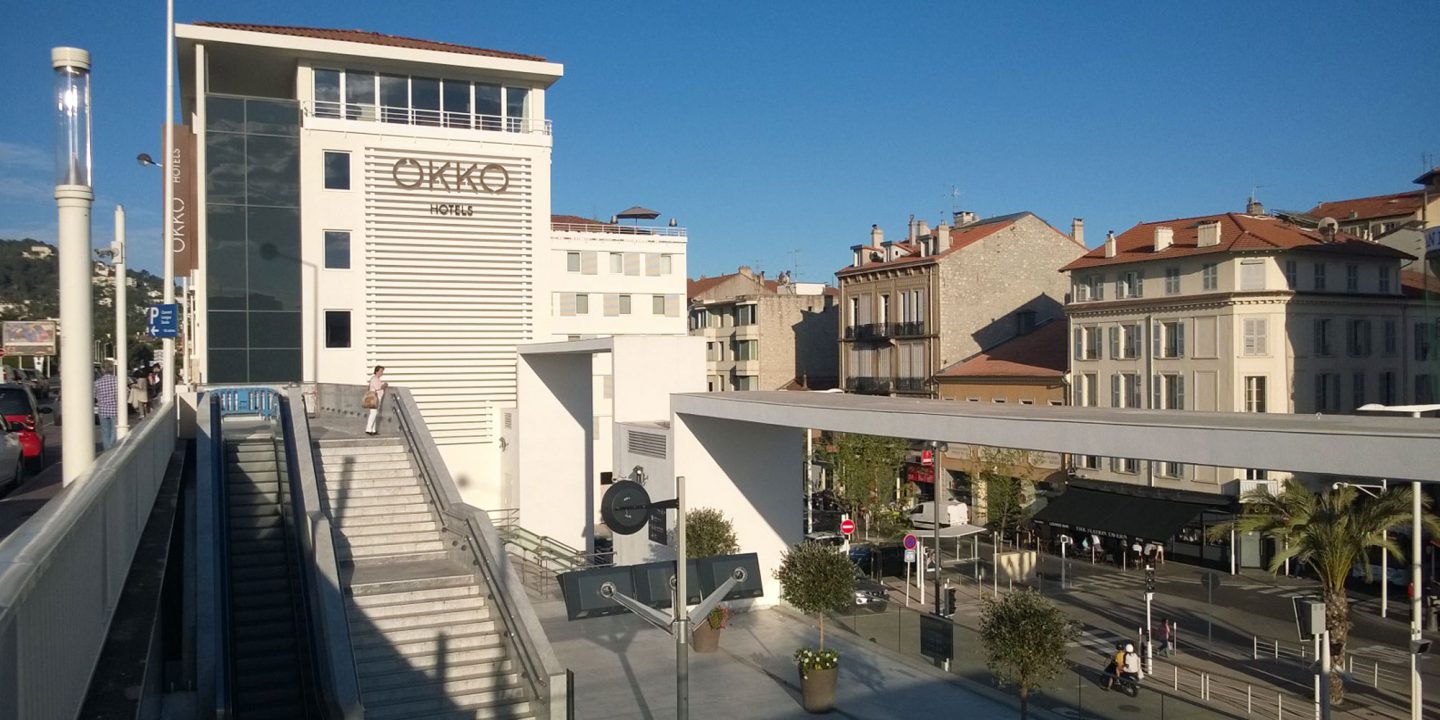 Les axes des voies perpendiculaires à la gare sont marqués par de grands cadres blancs, qui jouent un rôle de points focaux dans la perspective des rues et créent l’identité du lieu. Ce motif est renforcé par les cadres des vitrines commerciales, qui s’en inspirent, tandis que la façade de l’hôtel porte également un cadre monumental. L’ensemble immobilier constitué de la gare, des commerces et de l’hôtel est entièrement blanc : la référence aux grands immeubles balnéaires, qu’ils relèvent d’une architecture moderniste, ou plus décorative, est évidente. Tous les éléments de modénatures ne dérogent d’ailleurs pas à ce coloris : les persiennes coulissantes de l’hôtel sont teintées en blanc, ainsi que les châssis des fenêtres. L’immeuble joue un rôle urbain particulier, compte tenu de sa situation de « restanque » adossée à la couverture des voies : il assure la transition entre le niveau bas de la ville et le boulevard urbain.