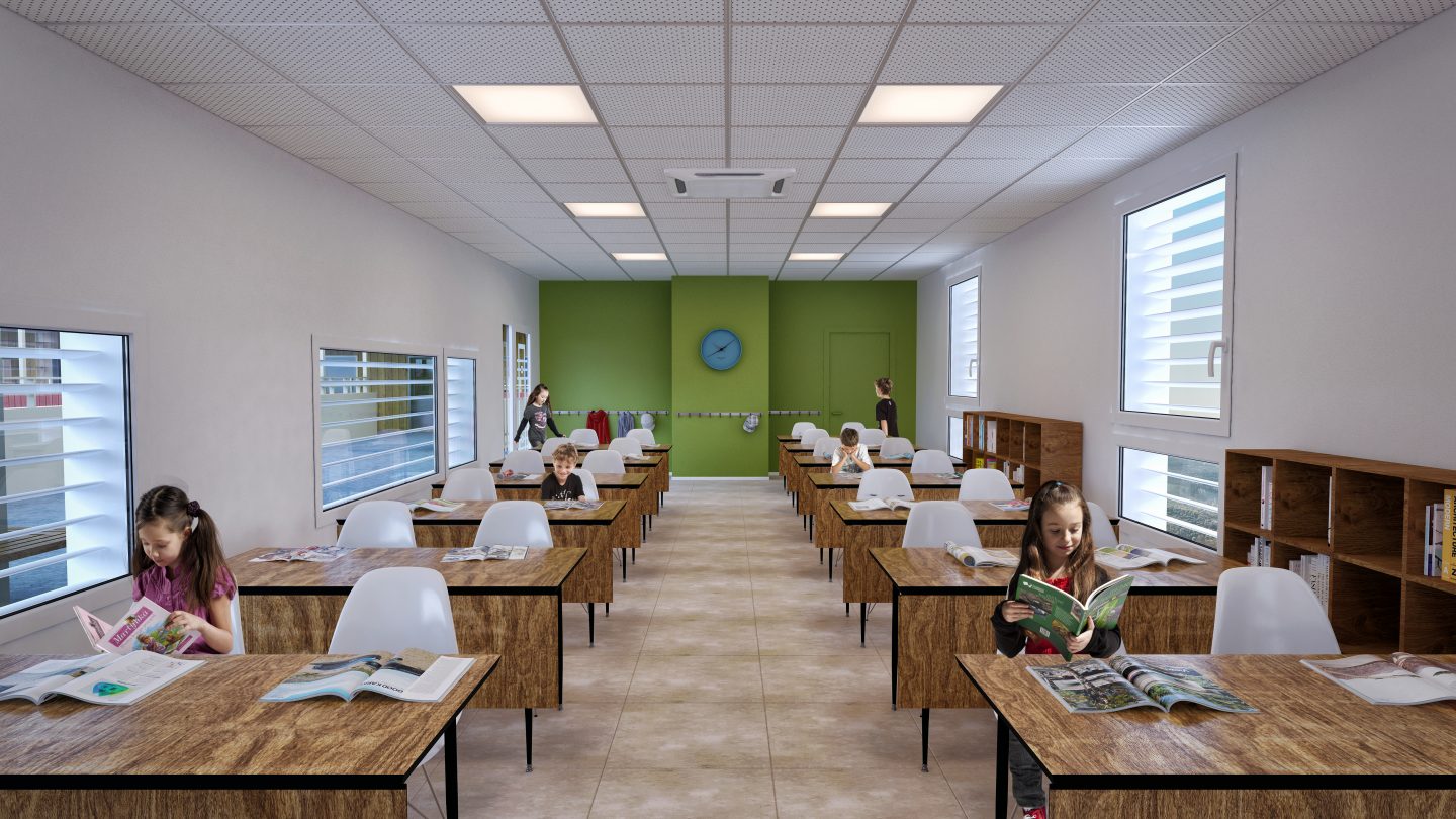 Le projet est conçu avec un plan en U afin de construire le long des axes routiers nord et ouest ainsi que sur le flanc Est de la parcelle. Cette implantation permet de dégager des cours centrales encadrées par un bâti permettant de protéger les enfants de l’environnement extérieur.