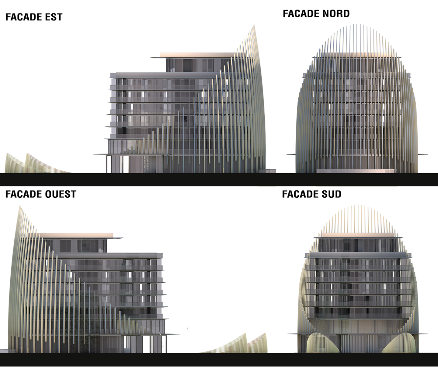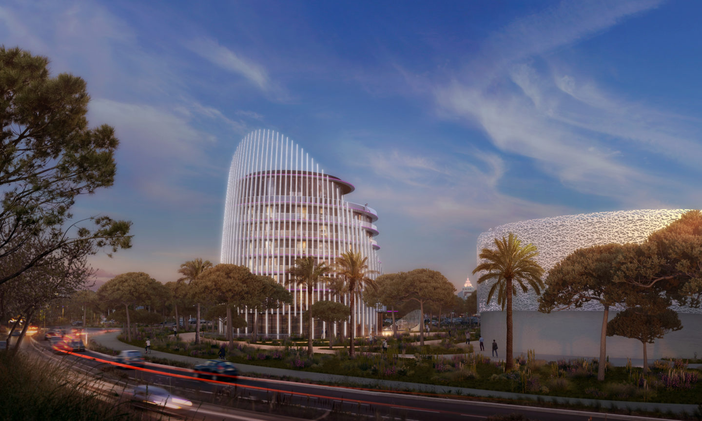 L’hôtel, largement visible depuis les accès environnants, s’élance au Nord avec une coque de lames verticales blanches élancées qui assurent sa stature et son élégance et forment une protection intermédiaire entre l’espace urbain routier et le Cœur d’Agde, paysager et piéton, tourné vers la ville, le port et la mer.