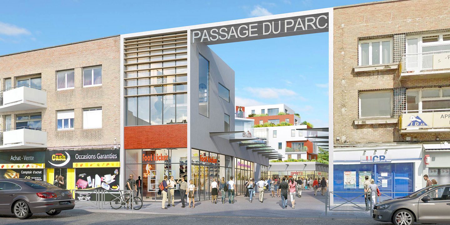 Le passage couvert que nous proposons est un point focal du dispositif architectural que nous mettons en place. Son rôle commercial est bien sûr particulier, puisqu’il regroupe moyennes unités et restaurants : l’atmosphère qui va l’habiter en découle, et elle est déterminante. Plus qu’un « passage », cet endroit devient une destination ludique. Le pôle de restauration, tourné à la fois vers le parc et vers la rue intérieure, est un endroit plaisant de rencontres et de fraternité. L’architecture du passage est inédite en centre-ville de Dunkerque : il s’agit de venir créer un bâtiment « point de repère », qui vienne naturellement s’inscrire entre le Pôle Marine et le Centre Marine. Nous avons opté pour une structure en bois, de larges portées, un habillage de lames de bois clair et une très large ouverture à la lumière, particulièrement nécessaire, puisque la façade sur le parc est orientée au Nord. Les lignes de ce bâtiment sont pures : C’est un grand parallélépipède, dont la simplicité extérieure est soulignée par d’amples lignes courbes, séparant bardage et verre. Le long du parc, un auvent de protection en verre couvre les terrasses des restaurants. L’architecture intérieure vient contraster avec le calme qui émane du traitement des façades : la mise en valeur de la rotonde existante permet la création un faux plafond de staff qui manie courbes et contre-courbes pour produire un espace intérieur blanc et spectaculaire.