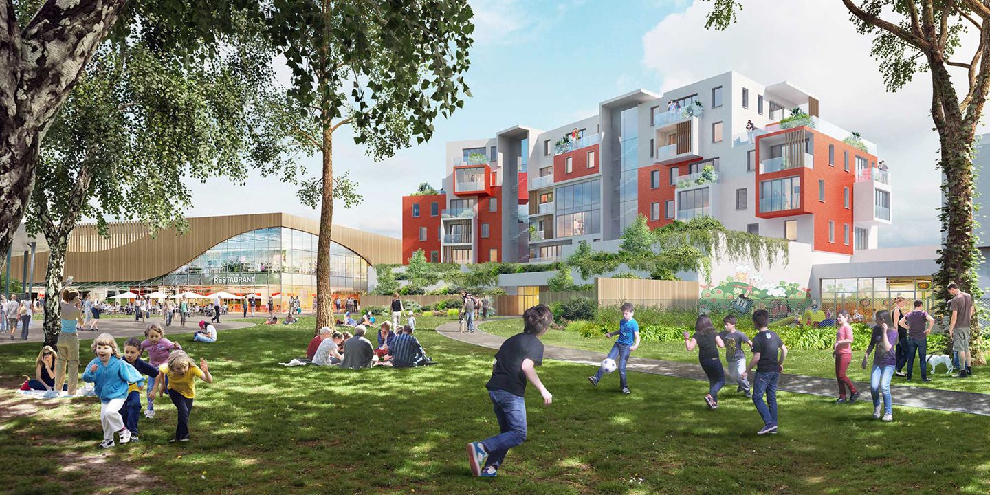 Comme nous l’avons indiqué, le passage couvert est un bâtiment en bois. L’idée de proposer une construction entièrement bois des immeubles de logements, en utilisant les techniques du CLT (Cross Laminated Timber) est bien sûr proposée, mais ne peut être développée qu’en plein assentiment de toutes les parties. Créer un trait d’union qualitatif entre le Parc de la Marine et le Boulevard Alexandre III. Le plan de masse proposé met en scène une grande brèche à partir du boulevard Alexandre III, vers le Parc de la Marine. Nous avons respecté cette disposition, et souhaité donner à l’accès du parc et du nouveau quartier une évidence symbolique : un haut portique cadre la vue vers le parc, tandis que de part et d’autre du cheminement, des commerces sont disposés pour inviter les passants à accéder à la rue commerçante.